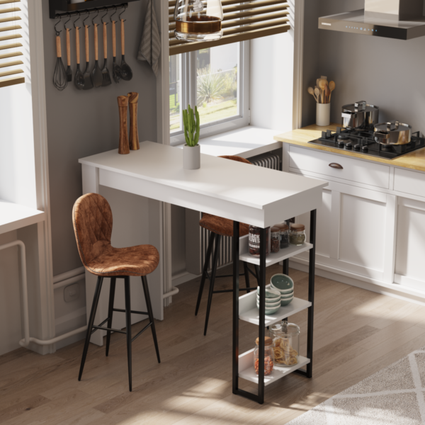 Modern mutfaklara ferahlık ve fonksiyonellik katan Amsterdam bar masası, beyaz rengiyle hem sade hem zarif bir atmosfer yaratır. Günlük kullanıma uygun yüksek tasarımı ve fonksiyonel raf sistemi ile hem yemek masası hem de bar masası işlevini bir arada sunar.