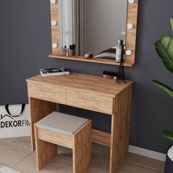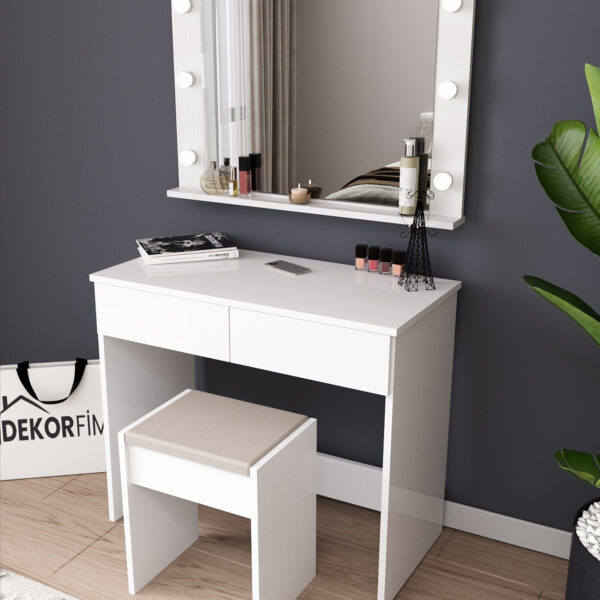 Ürünle birlikte gönderilen tabure, makyaj masasını tamamlayan ergonomik bir kullanım sunar. Kullanılmadığında masa altına kolayca yerleştirilebilir ve alan tasarrufu sağlar.