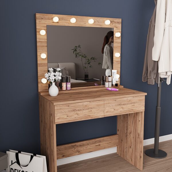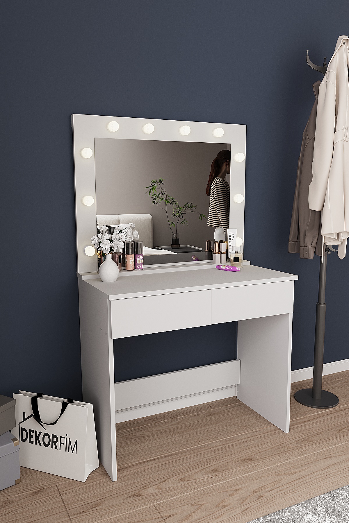 Şıklığı ve fonksiyonelliği bir arada sunan bu DF02108B Makyaj Masası, makyaj yaparken tüm ihtiyaçlarınızı karşılayacak şekilde tasarlandı. Yeni eklenen Hollywood ışıklı kulis aynası, profesyonel bir makyaj deneyimi yaşamanıza olanak tanır. Yüksek kaliteli ışıkları sayesinde hem doğal bir aydınlatma sağlar hem de makyaj sırasında detayları daha iyi görmenizi destekler.