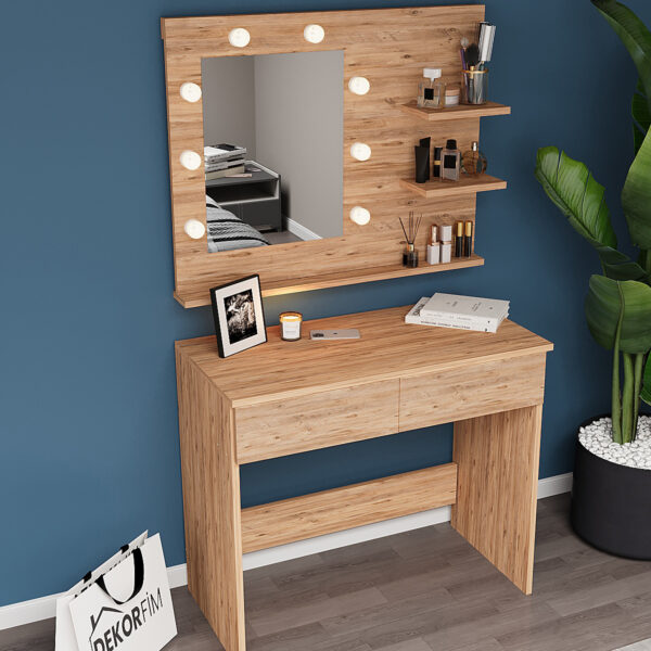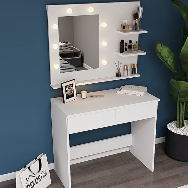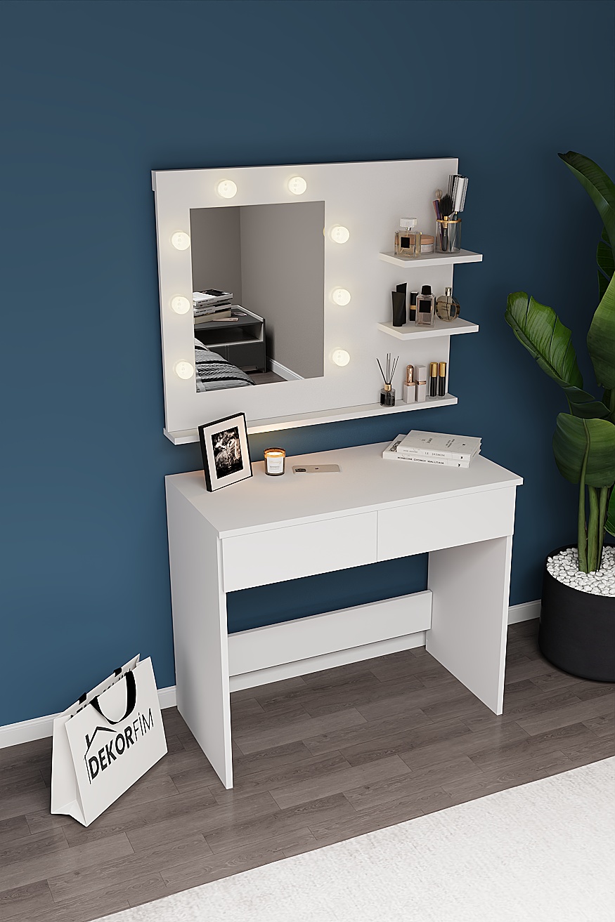Dekorfim ışıklı aynalı makyaj masası; modern tasarımı, geniş saklama alanları ve profesyonel makyaj deneyimi sunan LED aydınlatmalı aynası ile makyaj, bakım ve kişisel hazırlık alanınızı bambaşka bir seviyeye taşır.