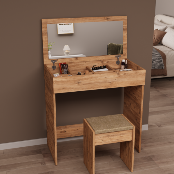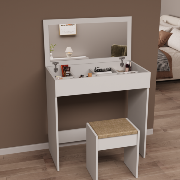 Kapaklı aynası, geniş iç saklama alanı, çok bölmeli tasarımı ve uyumlu pufu ile hem estetik hem de fonksiyonel bir kullanım sunan bu makyaj masası, yatak odanızın vazgeçilmez parçası olmaya aday!