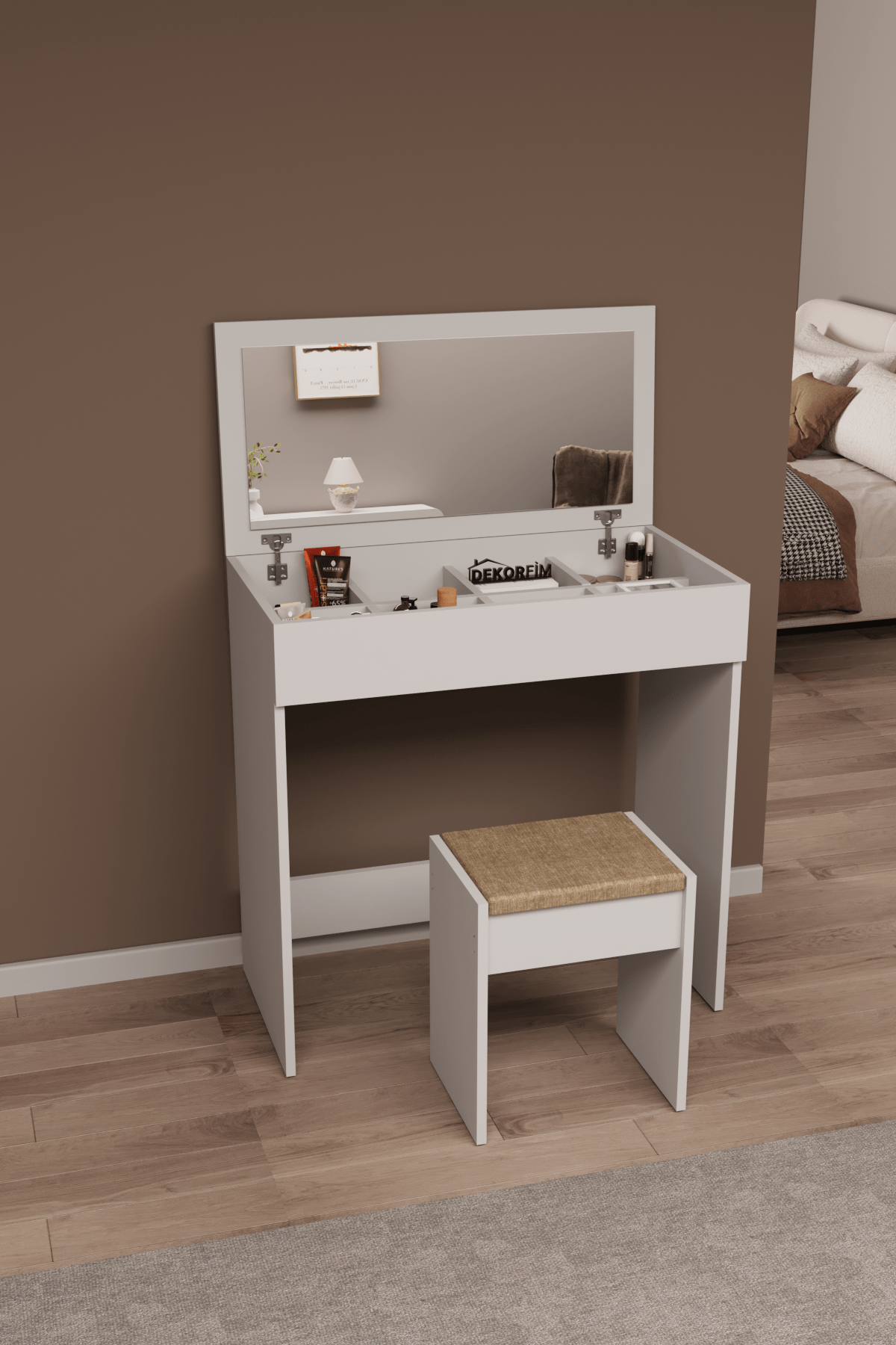 DF02113 Beyaz Aynalı Tabureli Makyaj Masası – Şık, Düzenli ve İşlevsel Tasarım