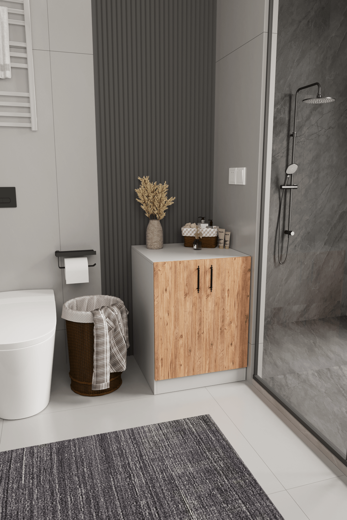Atlantik çam rengindeki kapakları, doğal ahşap dokusunu banyonuza taşır ve sıcak, modern bir atmosfer yaratır.