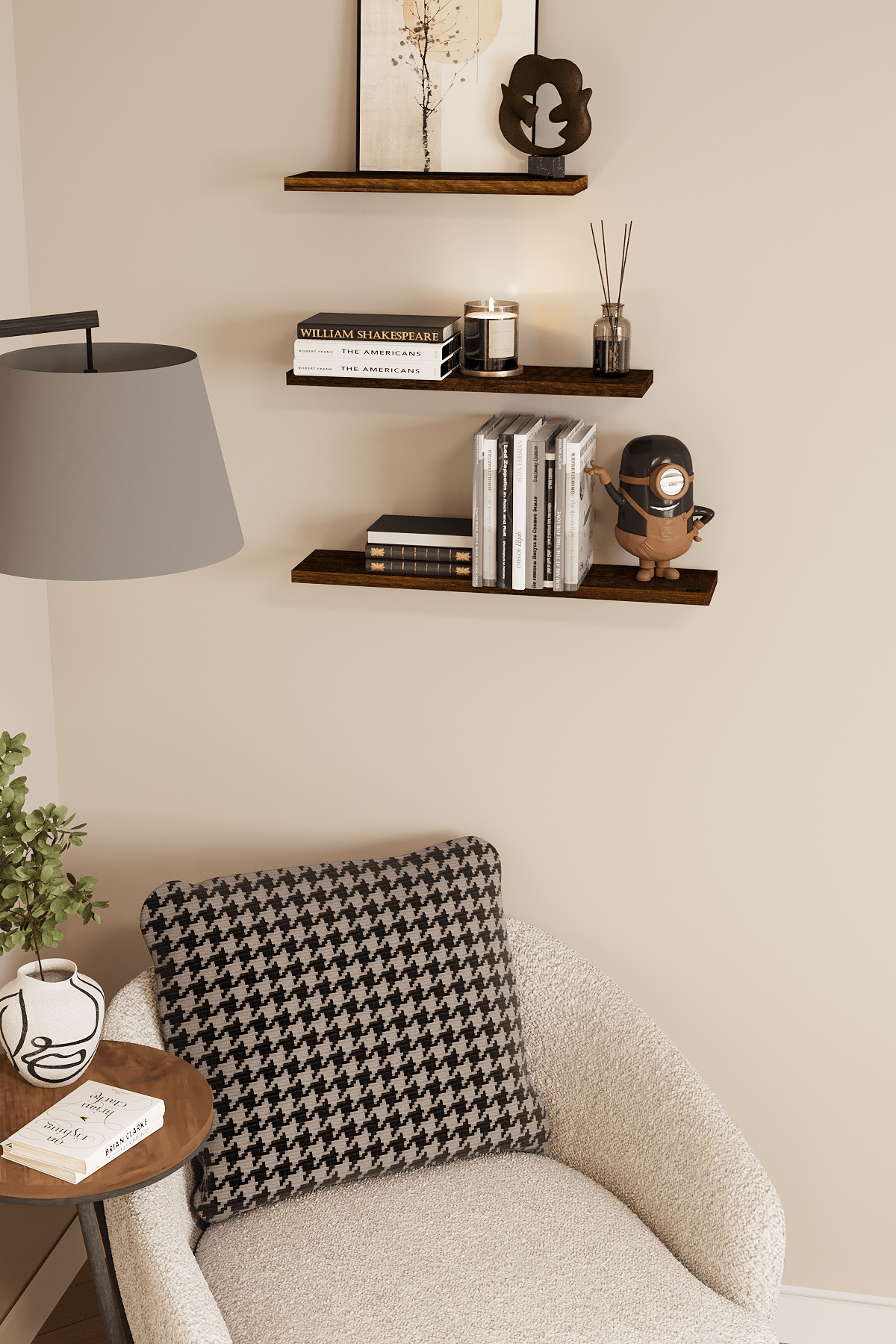 Klasik tonların modern tasarımla buluştuğu DF05102BR ceviz duvar rafı seti, evinizin duvarlarını zarafetle tamamlar. Üç farklı boydaki raf, dekoratif objeleriniz için şık bir sergileme alanı oluşturur.