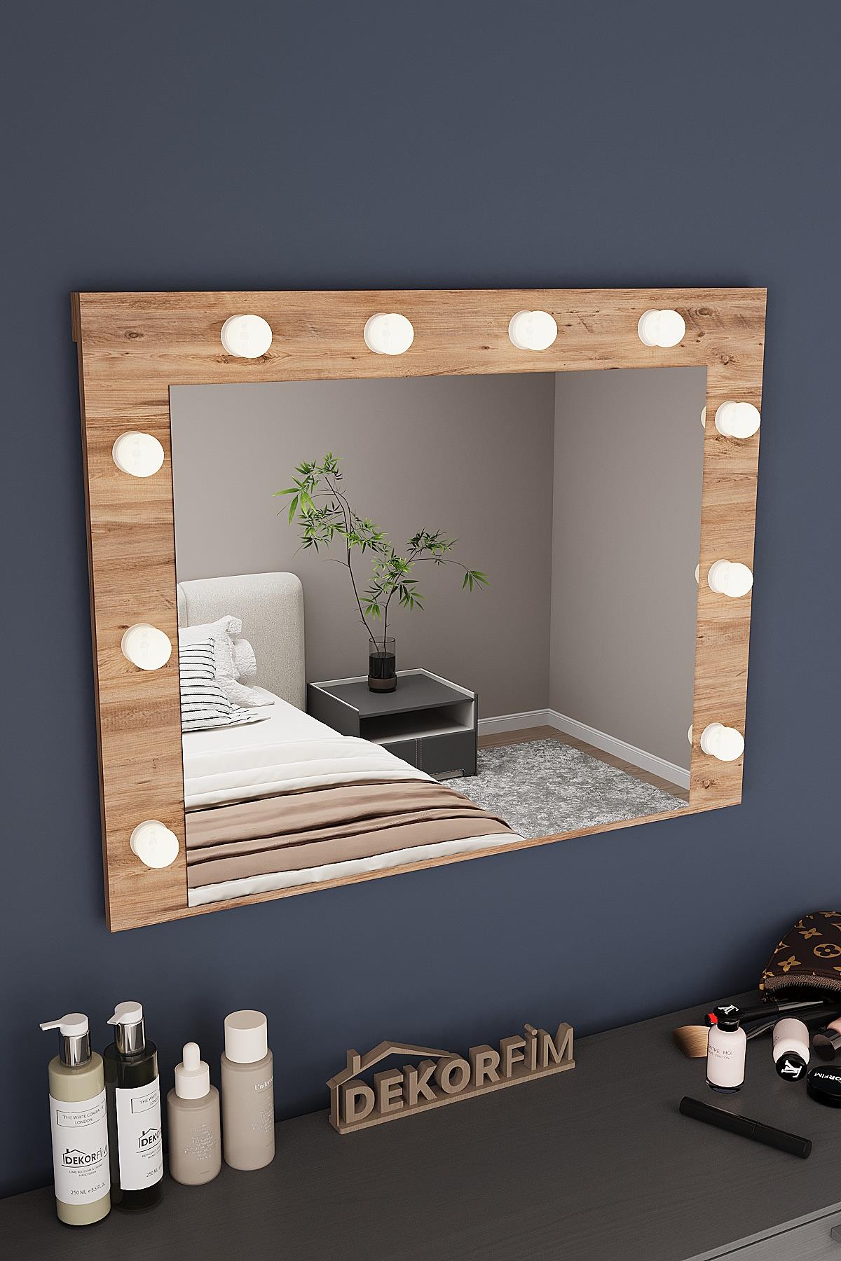 DF06101AC ışıklı makyaj aynası, Atlantik çam renginin doğal dokusunu modern LED aydınlatmayla buluşturur. 90x70 cm boyutuyla geniş bir görüş alanı sunarken, etrafını saran ampuller sayesinde profesyonel makyaj deneyimi sağlar.