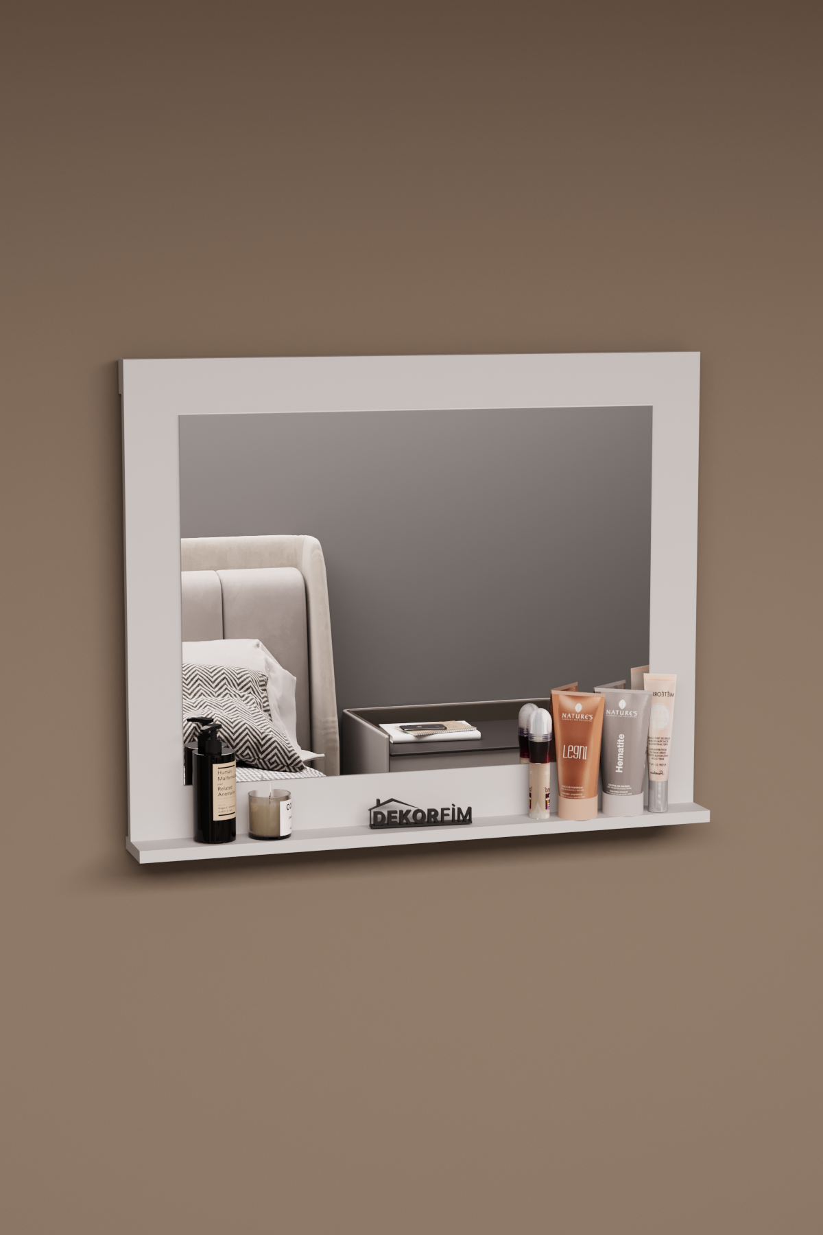 Modern çizgilere sahip DF06102B Beyaz Raflı Duvar Aynası, sade ve zarif görünümüyle yaşam alanlarınıza ferahlık kazandırır. 90 cm genişlik, 70 cm yükseklik ve 10 cm derinlik ölçülerine sahip bu ayna, alt kısmında yer alan kullanışlı rafı sayesinde makyaj malzemelerinizi, parfümlerinizi ya da küçük dekor objelerinizi düzenli biçimde sergilemenizi sağlar.