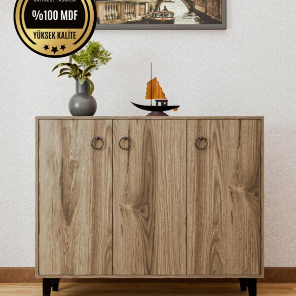 Tasarımında yer alan yüksek metal ayaklar, dolabın yere temasını minimuma indirerek temizlik kolaylığı sağlar. Özellikle robot süpürge kullanan evlerde büyük avantaj sunar. Üst tabla kısmı; biblo, anahtar kutusu veya dekoratif objelerle süslenebilecek genişliktedir.