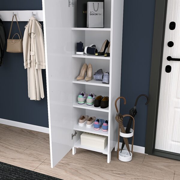 Dolap içerisinde yer alan 5 adet raf, temizlik ürünleri, havlular, banyo aksesuarları ve kişisel bakım ürünleri için yeterli alan sunar. Raflı yapısı sayesinde ürünlerinizi kategorilere ayırarak düzenli bir görünüm elde edebilirsiniz.