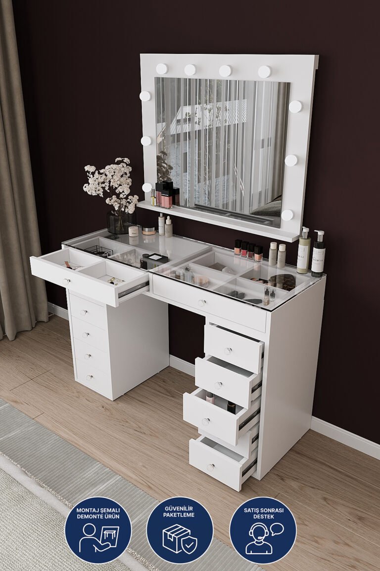 DF02116B Arel Üstü Camlı 12 Çekmeceli Makyaj Masası, Bölmeli Üst Çekmeceli Geniş Depolama Alanı